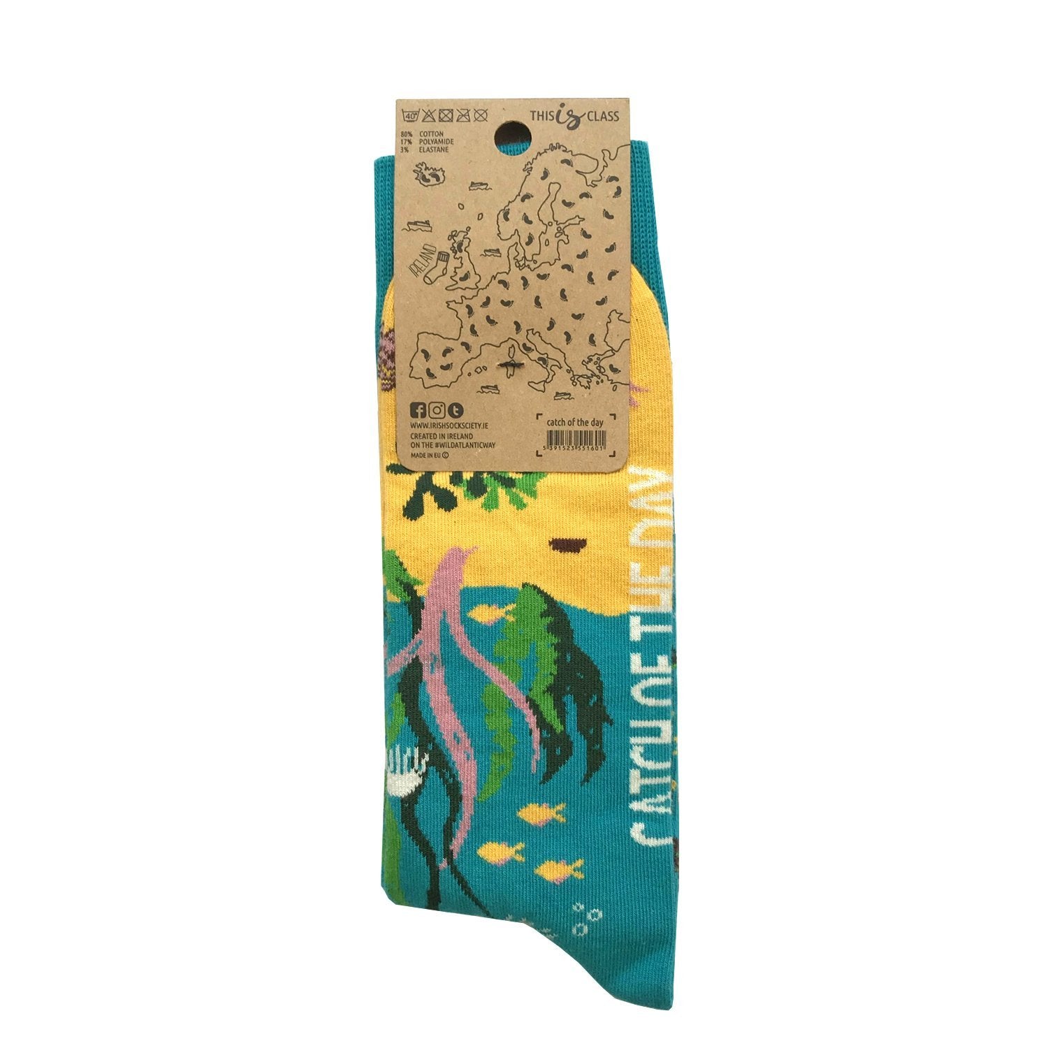 "Catch of the Day" is just what you ordered and it comes with fish and sea images, with the 'catch of the day' inscription on the underside of the sole!!! The perfect gift that will be sure to get you 5 star reviews. Let your feet guide you in style around all the best that Ireland has to offer. Designed and made specially by the Irish Sock Society, these excellent quality socks will get you "Havin' the craic from head to toe".