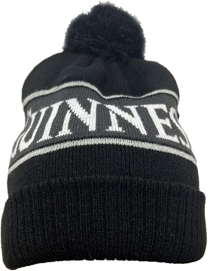 Guinness Official Merchandise, woven beanie hat with turn-up, and black bobble. Hat is black, with two light grey bands, and Guinness in white, on a charcaol grey background. Crafted with premium materials, it ensures comfort and durability whether you're on the sidelines or enjoying a pint with friends.