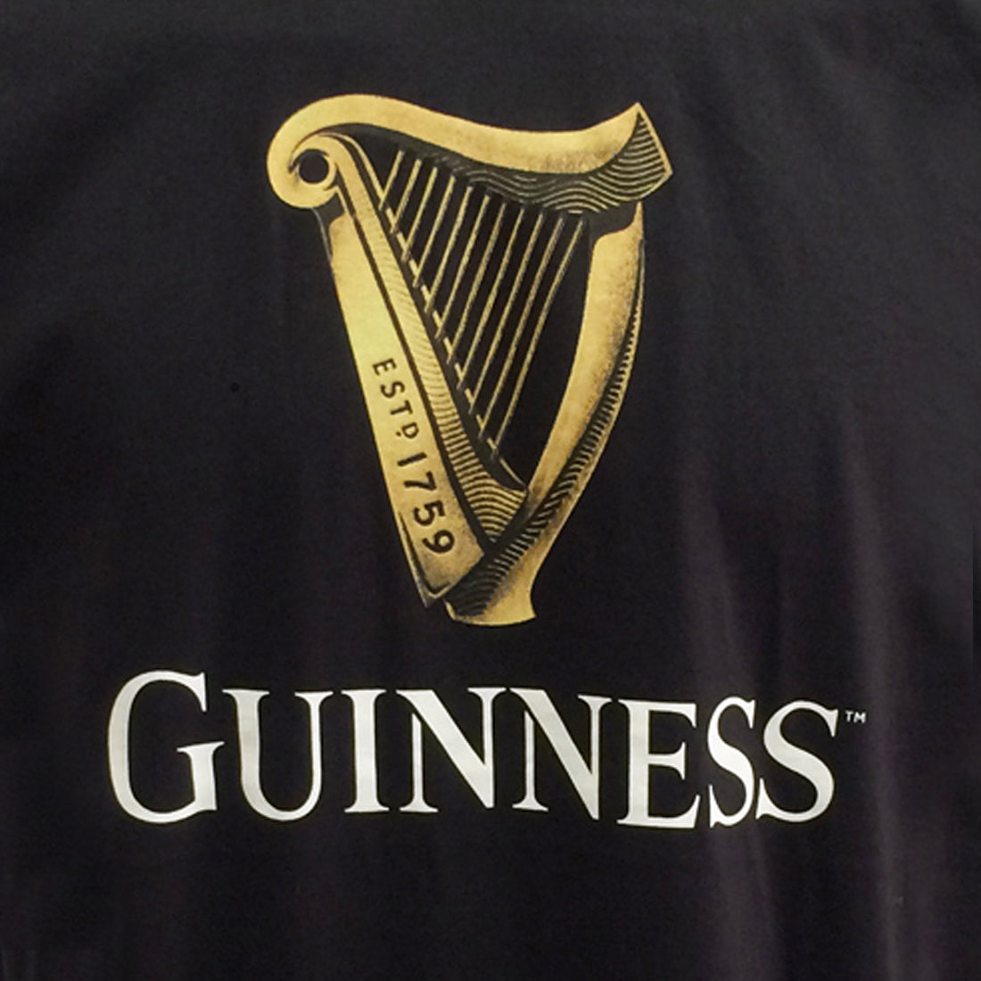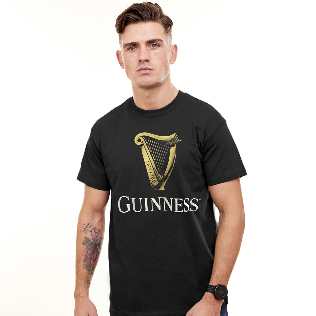 Official Guinness Merchandise. Wear your love for Ireland's favorite beer with this classic black t-shirt. Featuring white "Guinness" text and the trademark Irish harp in gold, this tee is anything but basic. Available in a variety of sizes and made of high quality materials, you can rest assured you'll be wearing an authentic piece of Ireland.