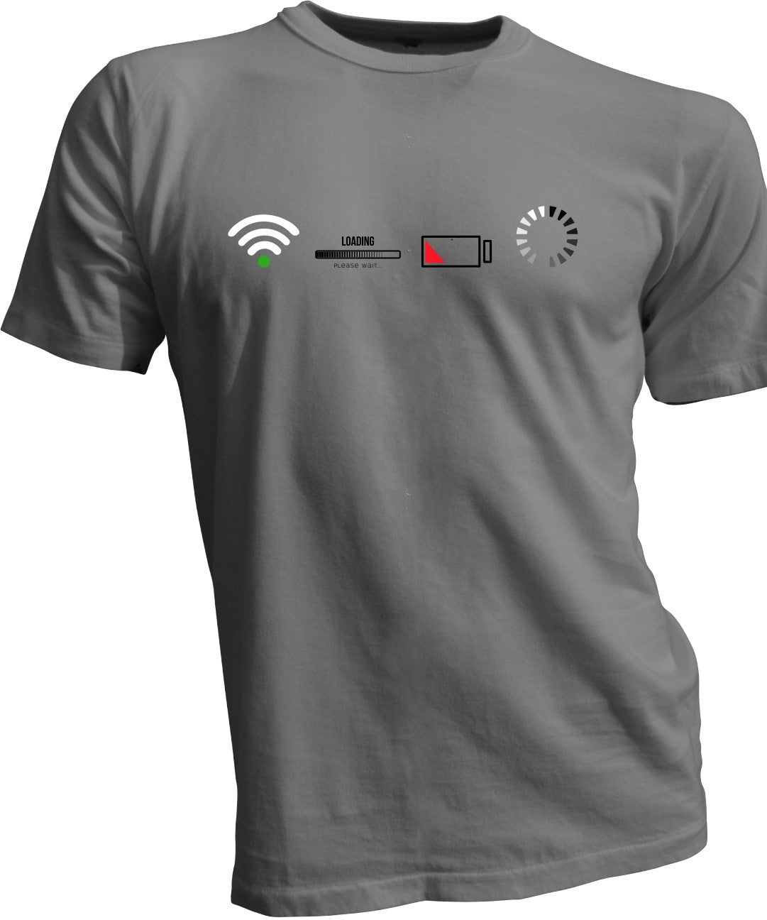 4 icons that will be familiar to anyone who spends time in front of a screen, low Wi Fi symbol, 'loading', low battery and 'working' on this plain light grey 100% cotton T shirt, with the design printed in grey and colour print