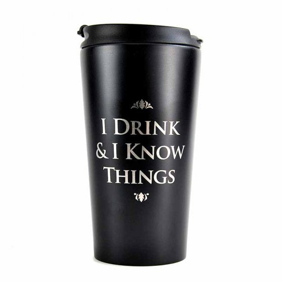 This Game of Thrones travel mug is the ideal travel companion. With a matte black finish, it features Tyrion Lannister's famous quote "I Drink & I Know Things" in silver metallic detailing. The metal mug is double walled to keep drinks hot for longer and features a screw top lid with a flip top mechanism to prevent spills. Perfect for those who want to take a bit of Lannister attitude with them wherever they go.