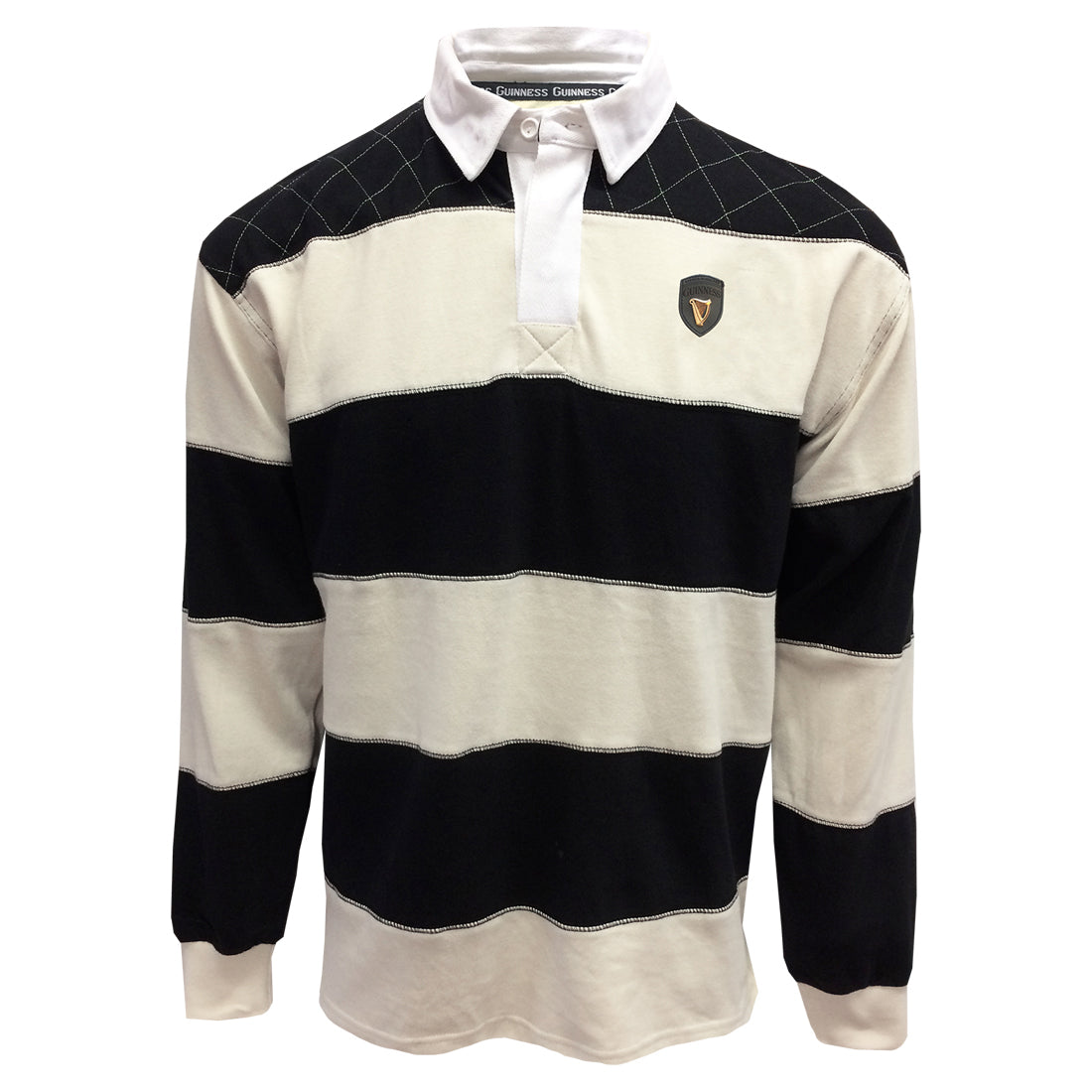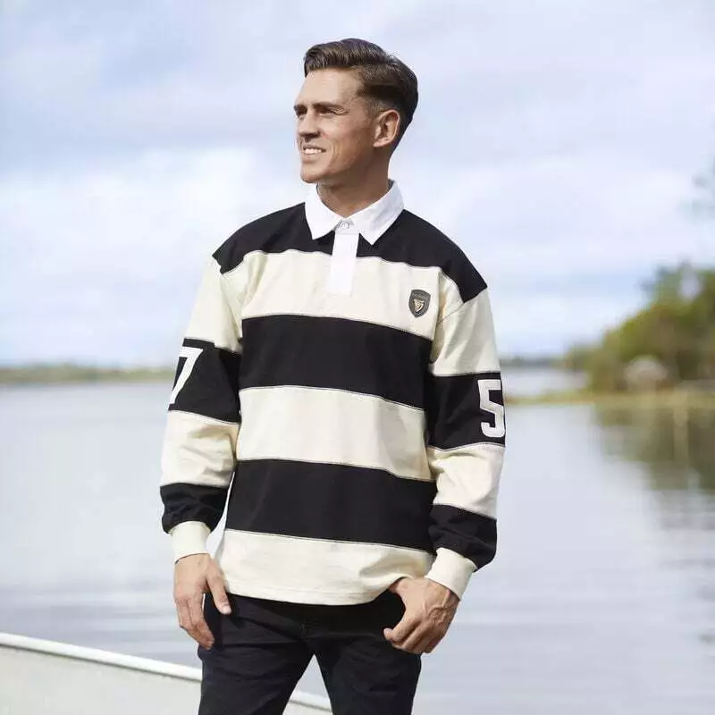 This classic rugby shirt, black and cream striped, long sleeve, combines comfort and durability,