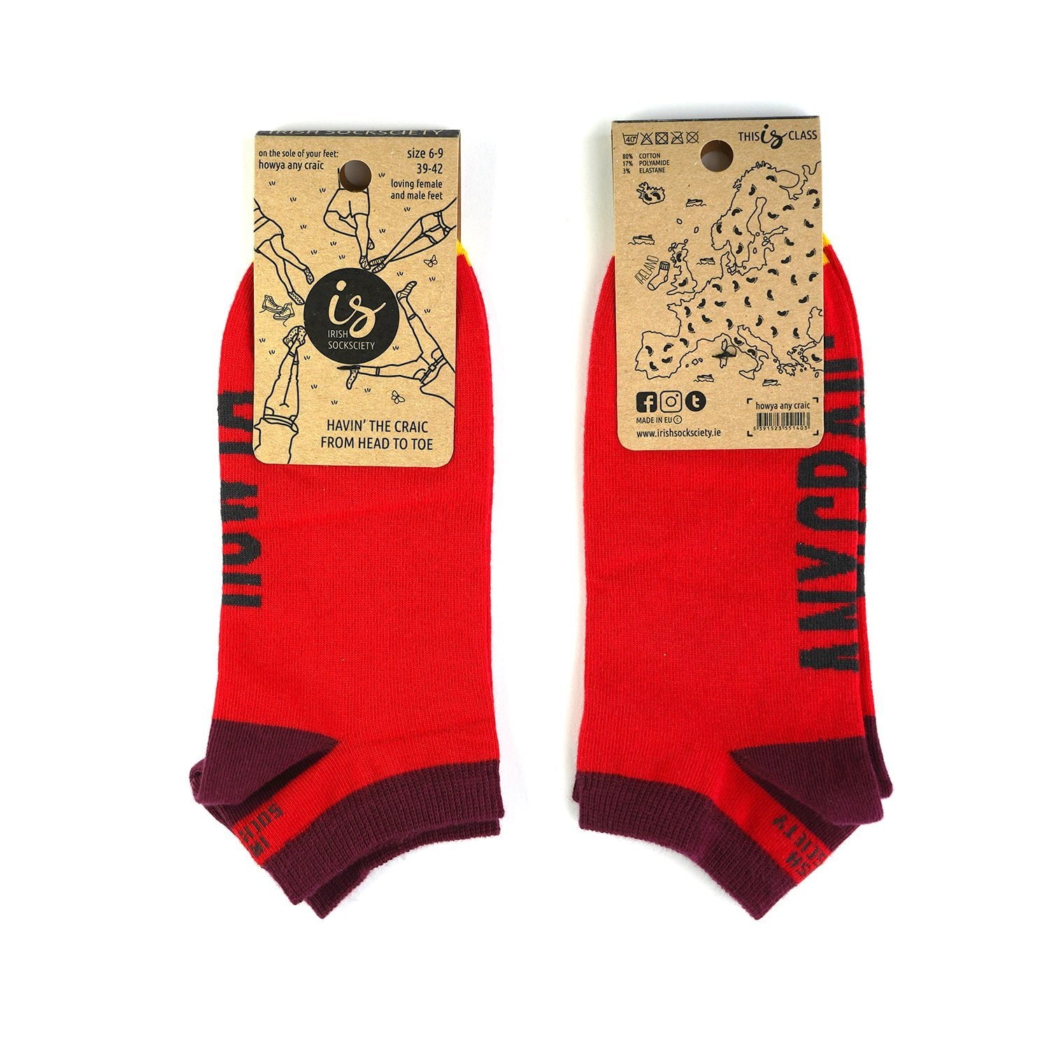 Howya, any craic is a fairly typical Irish greeting, translation, How are you, any news, or what is happening. Life is serious enough, so bring some fun and humour into your wardrobe. Designed and made specially by the Irish Sock Society, these excellent quality socks will get you "Havin' the craic from head to toe".