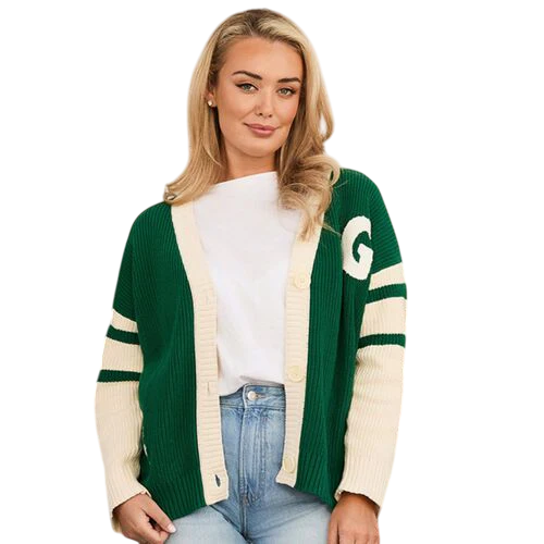 A classic cardigan with unmistakable heritage appeal. This green and cream knit cardigan features bold contrast sleeves, varsity-style striping, and a statement G chest detail for a timeless, retro-inspired look.
