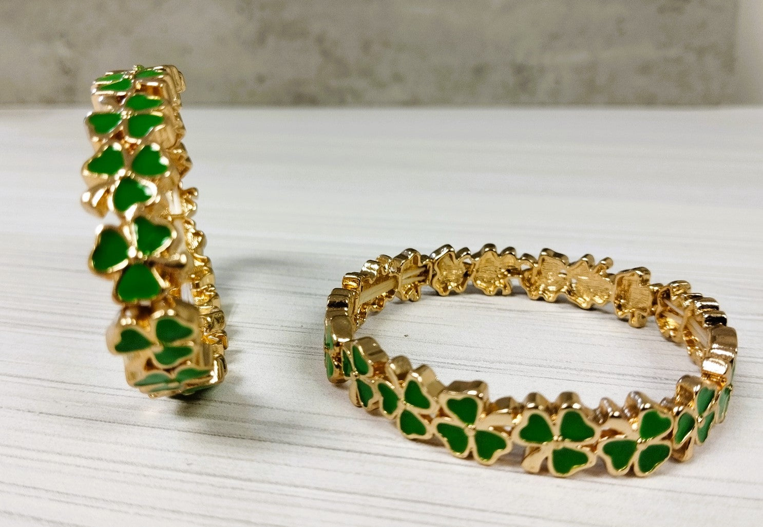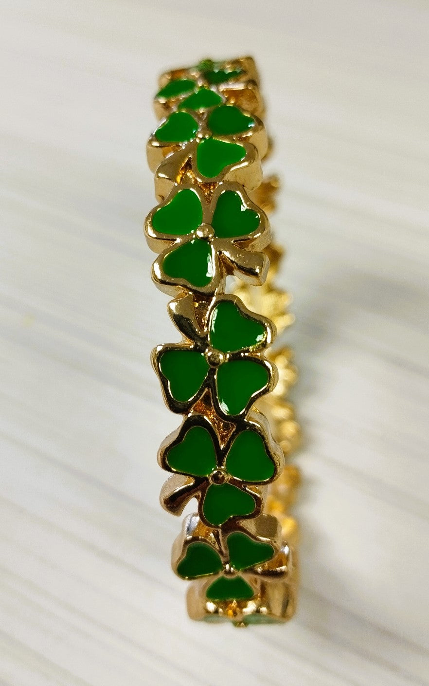 Shamrocks set in a gold color bracelet, one size, elasticated bracelet, colors are bright and vibrant