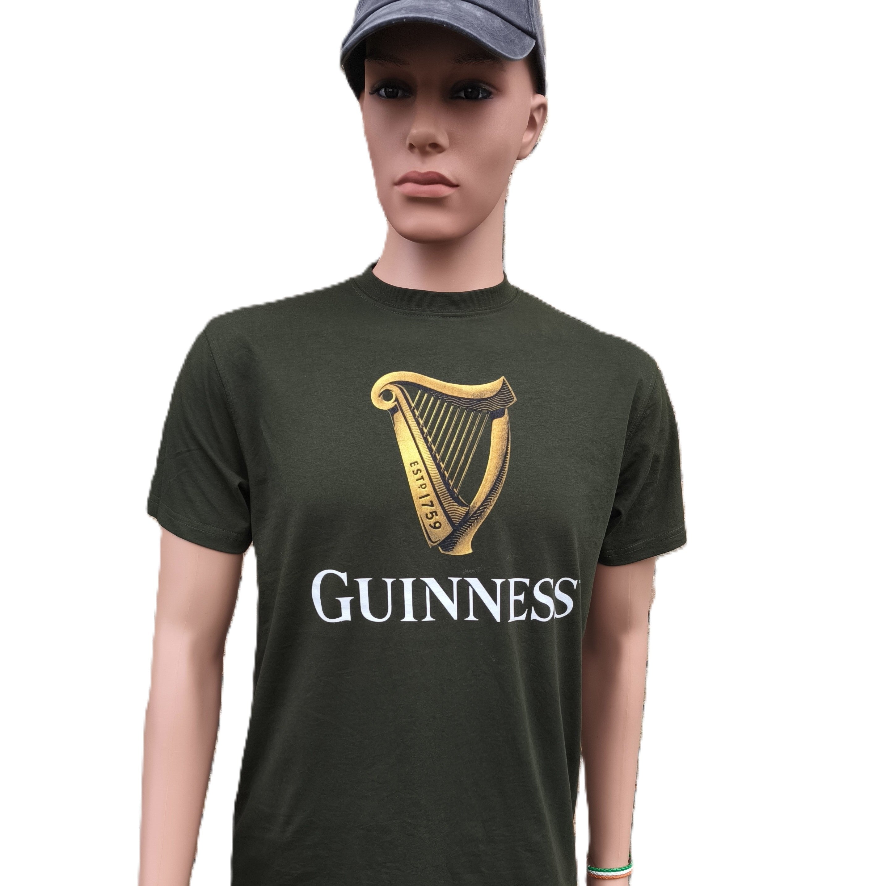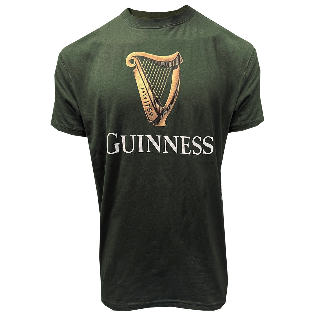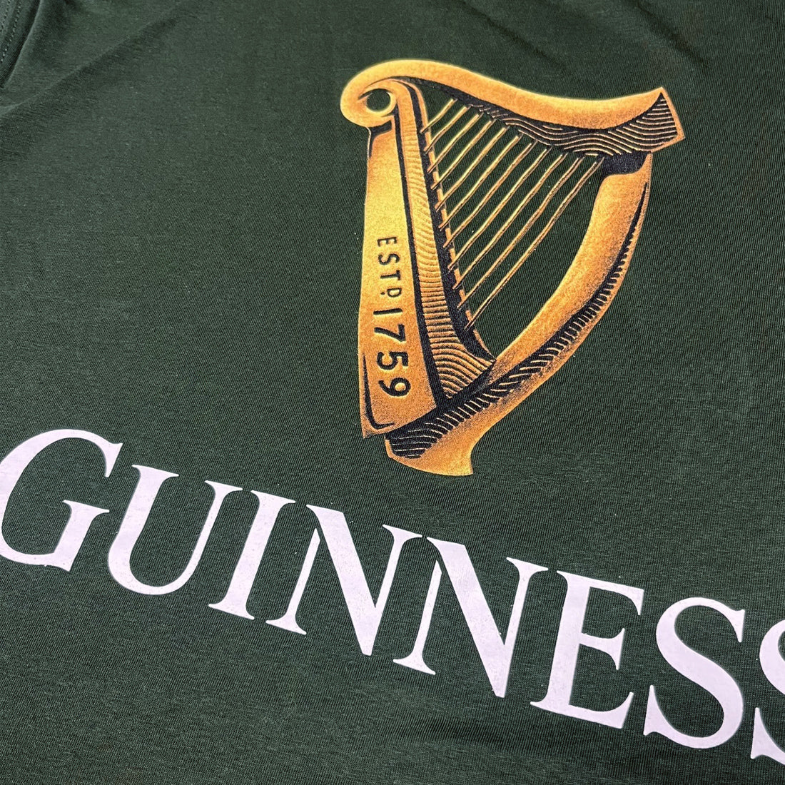 Official Guinness Merchandise. Wear your love for Ireland's favorite beer with this classic dark green t-shirt. Featuring white "Guinness" text and the trademark Irish harp in gold, this tee is anything but basic. Available in a variety of sizes and made of high quality materials, you can rest assured you'll be wearing an authentic piece of Ireland.
