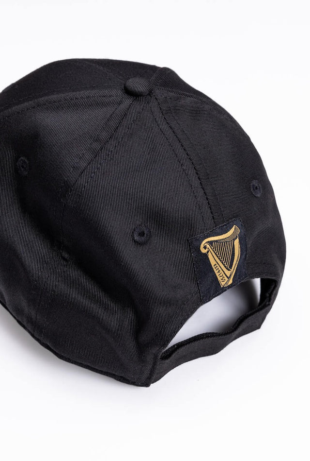 This baseball cap is part of the official Guinness merchandise. This black baseball cap has a Guinness Pint logo in front and a gold harp at the back. This baseball cap is made from 100% recycled materials.