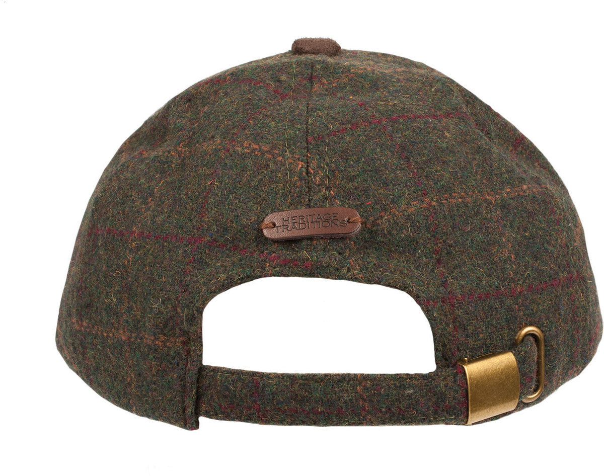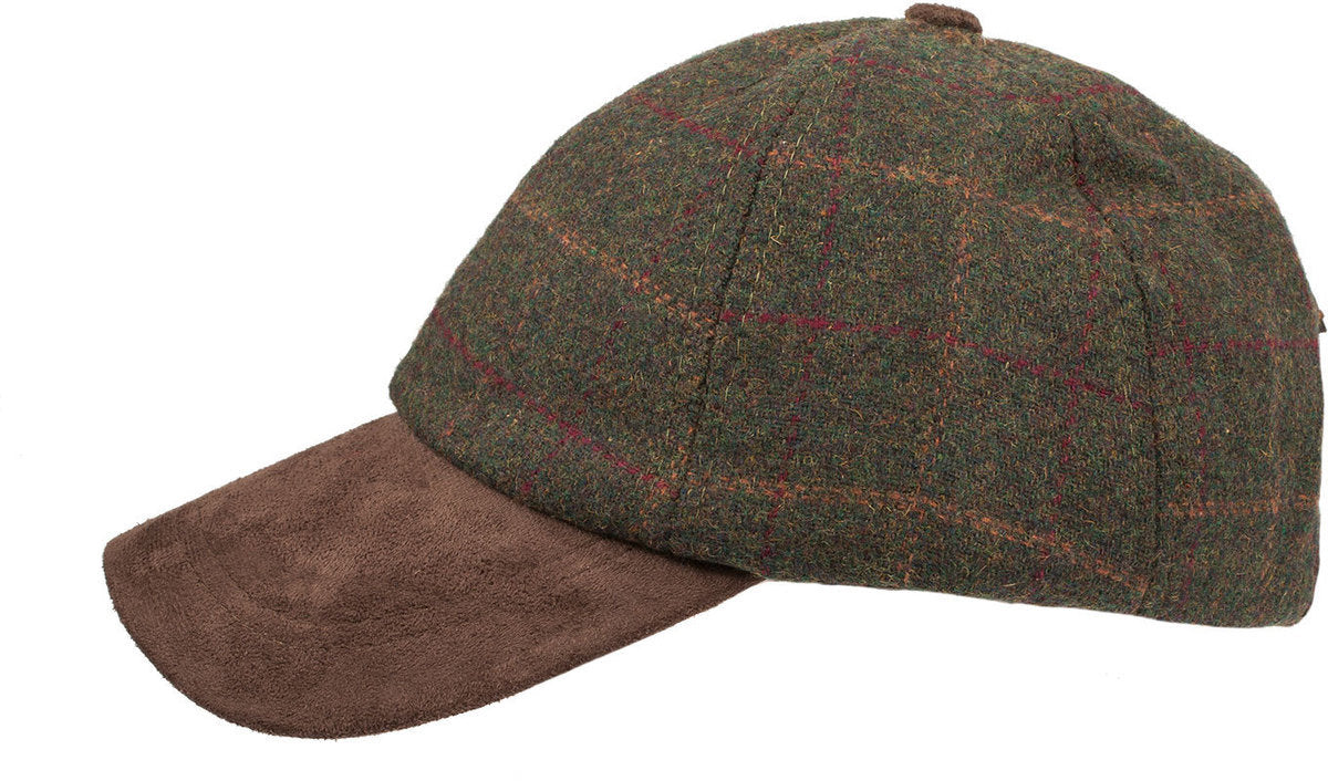 A baseball hat made with traditional materials. The cap is made of Green box check tweed with a brown suede peak. The cap is adjustable size with a back adjuster with an Antique brass fastener, very fashionable and casual.