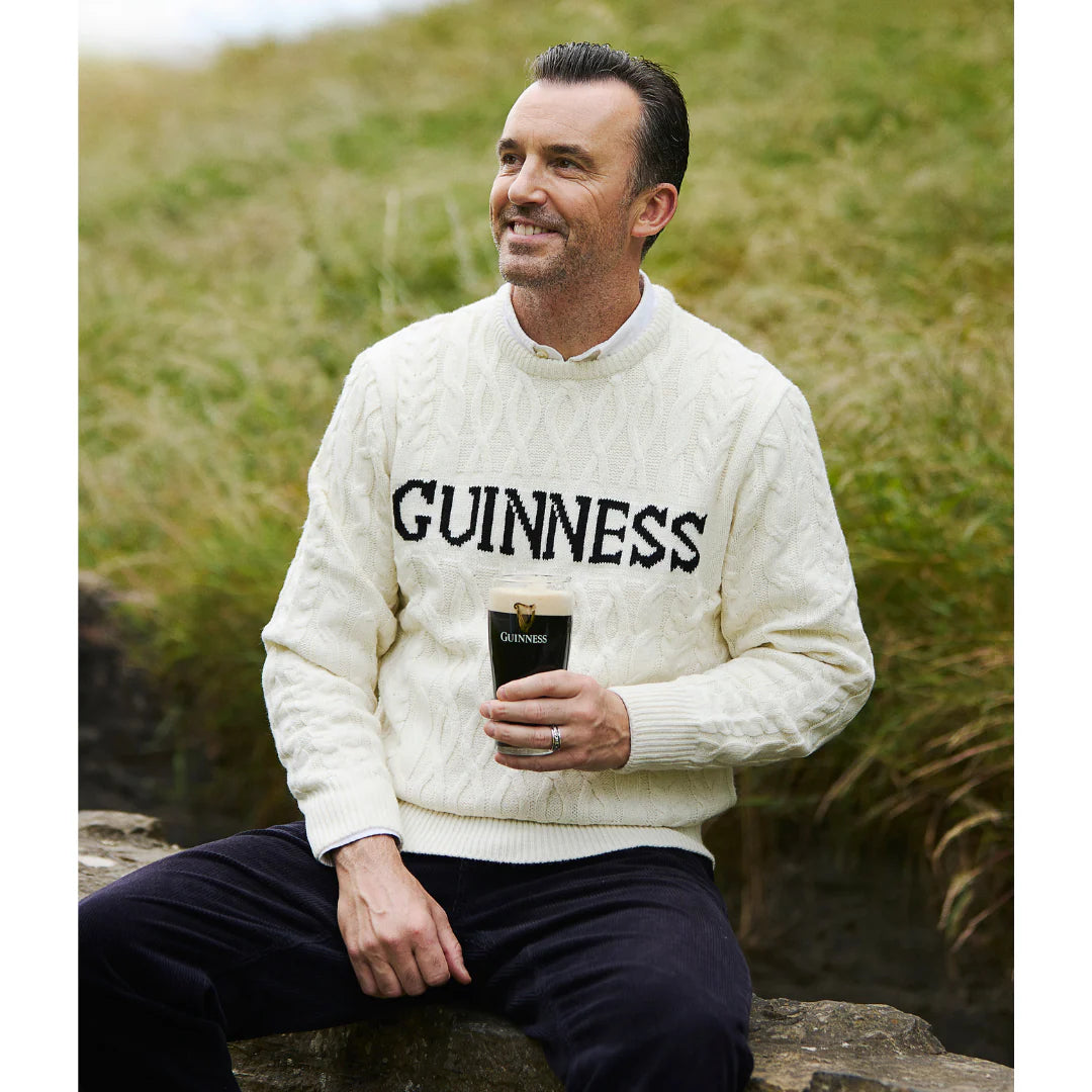 Knitted in a traditional Aran cable pattern, this jumper features a clean crew neckline and a bold Guinness logo across the chest, creating a striking contrast against the natural white knit. Inspired by authentic Irish Aran sweaters, the textured design offers warmth, durability, and enduring style.