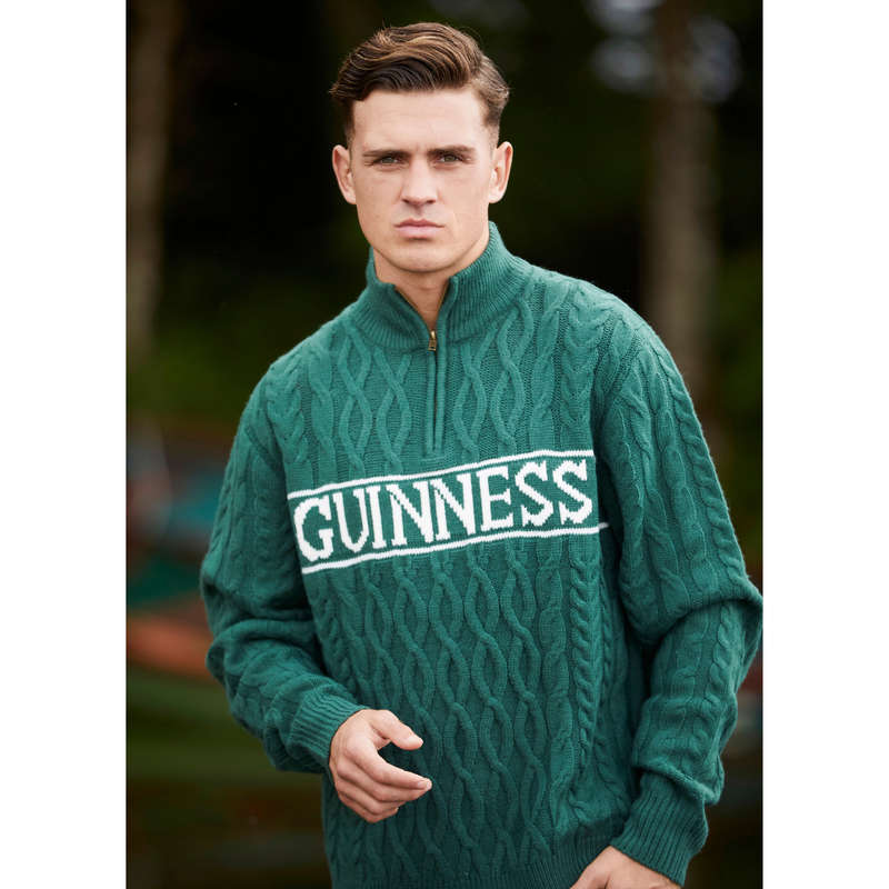 Crafted in a rich heritage green and finished with a bold woven Guinness logo across the chest, this jumper is inspired by classic Aran knitwear while offering a contemporary fit and feel. The textured cable-knit pattern adds depth and warmth, while the half-zip neckline allows for easy layering and everyday versatility.