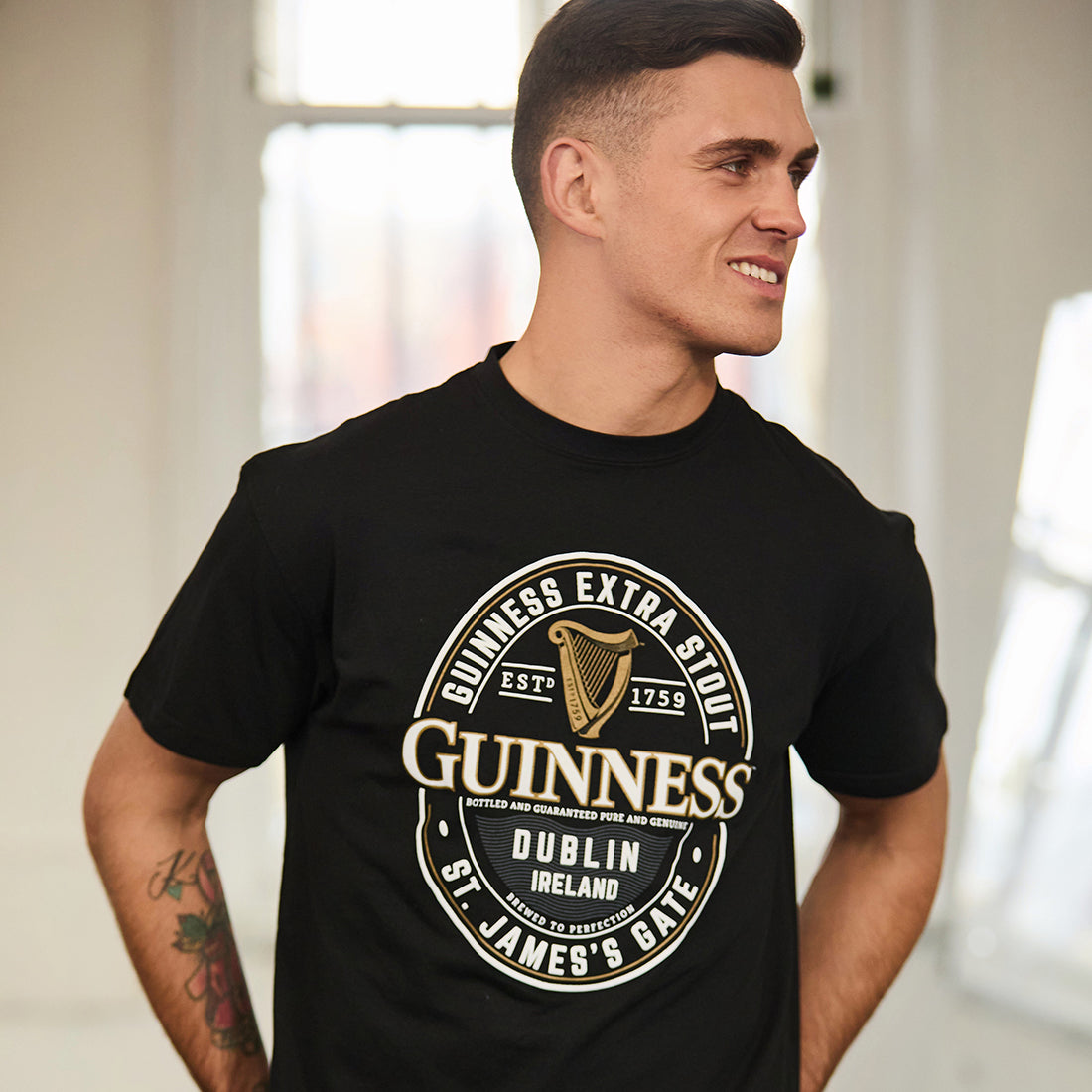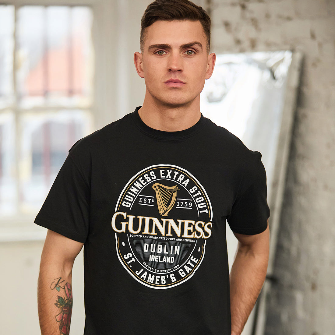 Official Guinness Merchandise. This classic black t-shirt features the label on bottles designed for export. Guinness Foreign Extra Stout has extra hops and a higher alcohol content so that is can last longer on long voyages abroad. It is what people typically drink in Africa Asia and the Caribbean. This t-shirt is made with 100% recycled materials.