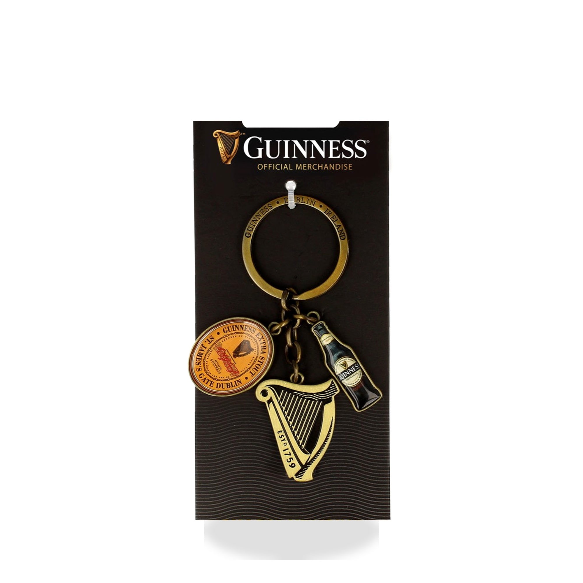 These keyrings each have three charms, Harp. Labels and Bottle,