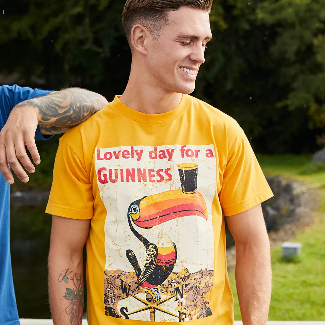 This Guinness Graphic T-Shirt features the classic “Lovely Day for a Guinness” slogan paired with the iconic toucan artwork on a rich mustard yellow tee. The distressed-style print gives it a retro feel that’s perfect for casual, everyday wear.
