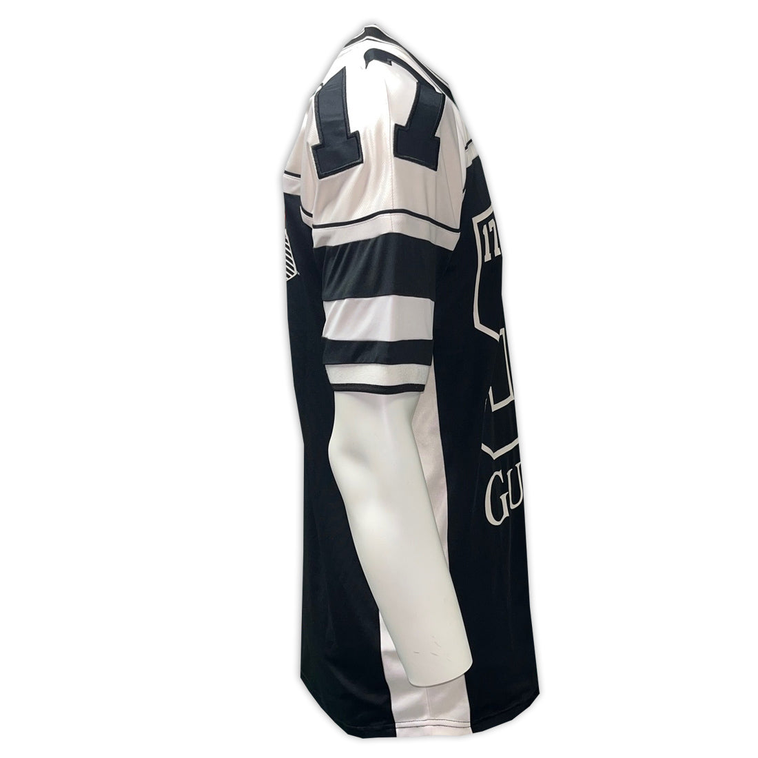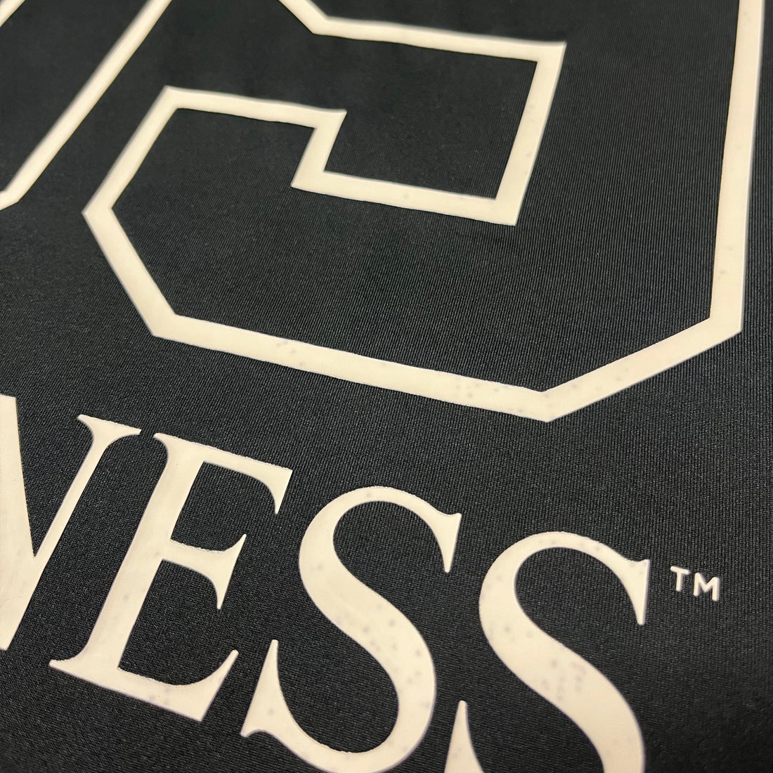 This Guinness American Football jersey features a vvery strong graphic design, front, back and sleeves. It has cut-and-sew panels with bold Guinness 1759 branding and premium shoulder appliqués. Designed with a ribbed V-neck, it's ideal for a relaxed, sporty-casual look. It can be worn in any sports or casual environment, colors are black and soft white.