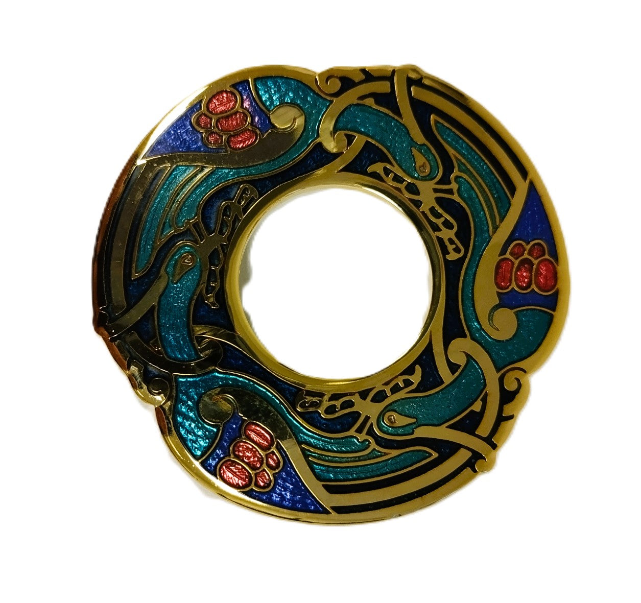 Celtic Brooches, Ireland's most loved symbols, the Triskelle, Celtic Knot in a circular design, Celtic Dragon, Celtic Birds, handcrafted in vitreous glass enamel, each piece is fired to 760°C.
