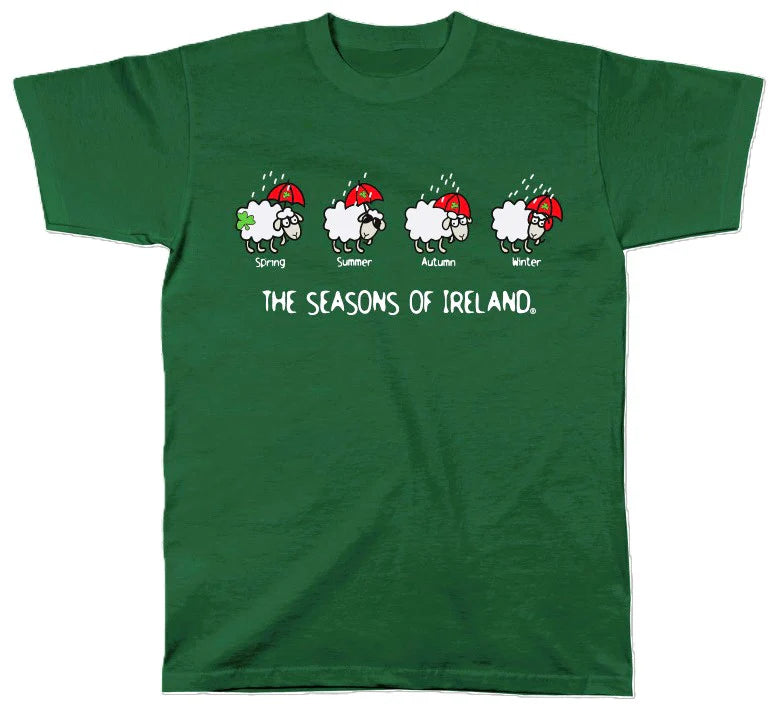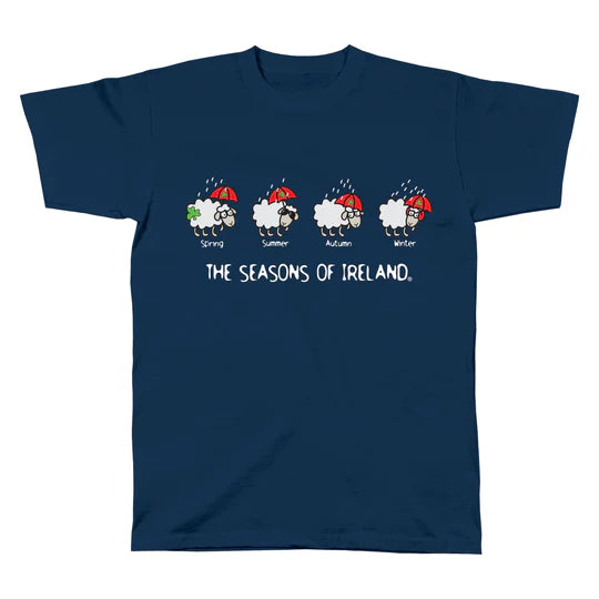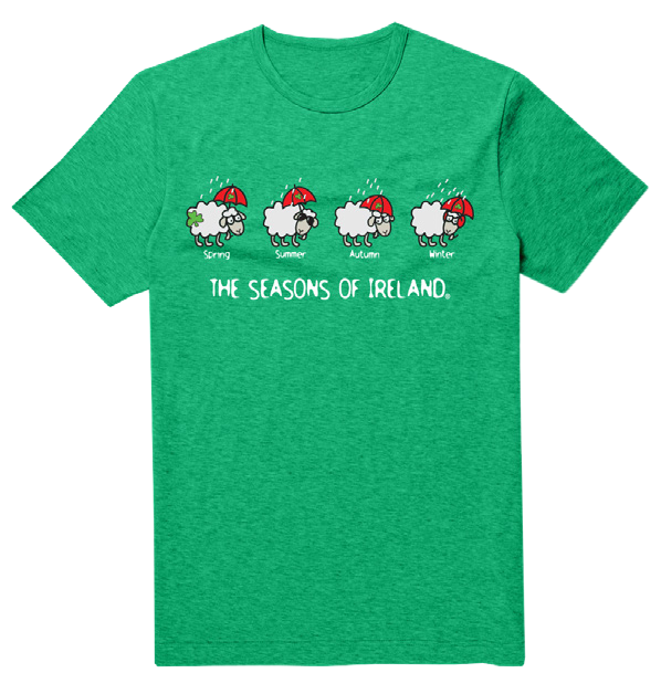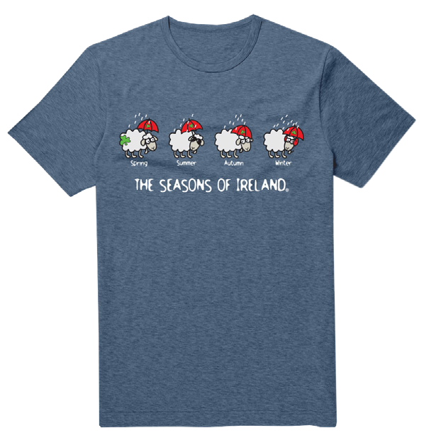 This men’s Irish humour t-shirt perfectly captures what locals already know — Spring, Summer, Autumn, and Winter in Ireland all look suspiciously wet. Featuring a lineup of cheerful sheep braving the rain, this tee is a fun, wearable nod to Ireland’s famously unpredictable weather.
